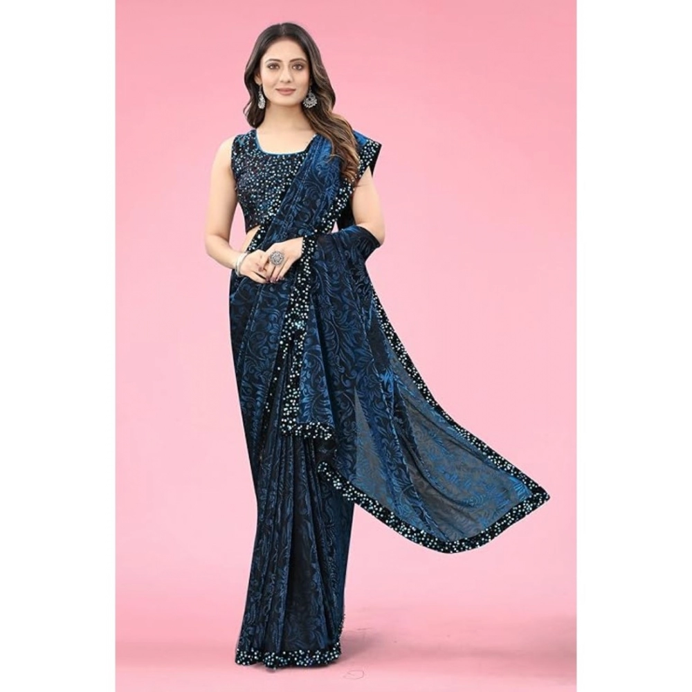 Generic Women’s Lycra Floral Saree With Unstitched Blouse (Blue, 5.5 Mtr)