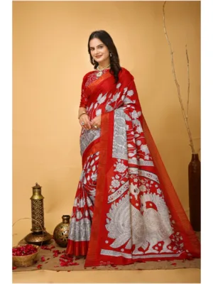 Generic Women’s Soft Handloom Cotton Kalamkari Printed Saree With Unstitched Blouse 5.5Mtr (Red)