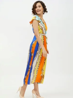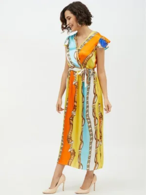 Women’s Satin Chain Print Cap Sleeve Calf-length Dress